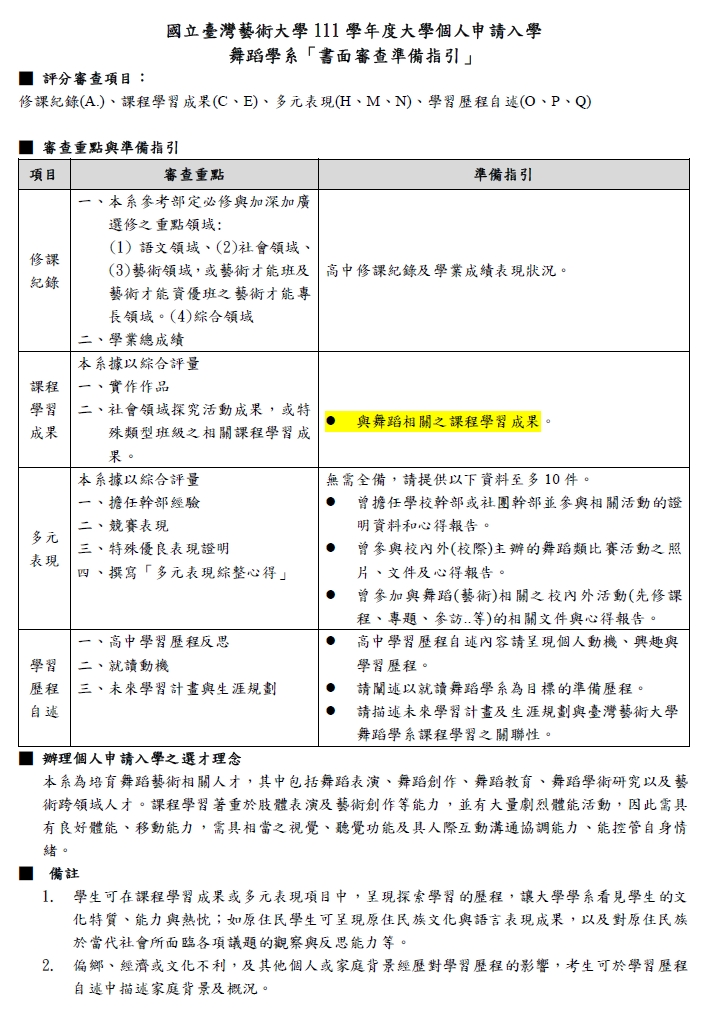 111學年度大學個人申請入學 舞蹈學系「書面審查準備指引」