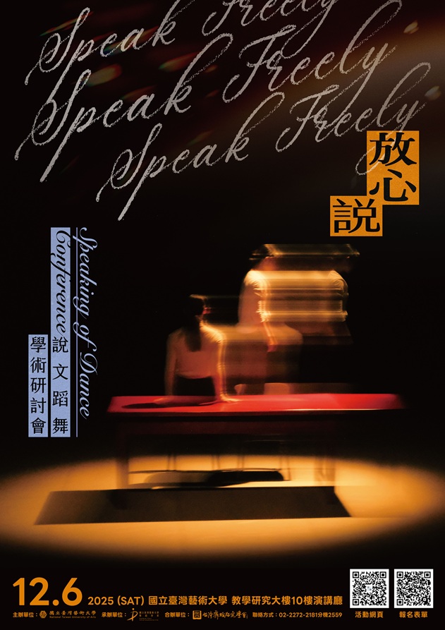 國立臺灣藝術大學舞蹈學系將於2025年12月06日(六) 8:30~17:00,本校教學研究大樓10樓演講廳(新北市板橋區大觀路一段59號)舉辦2025年說文蹈舞舞蹈學術研討會《放心說》暨台灣舞蹈研究學會年會,歡迎各界人士踴躍報名。